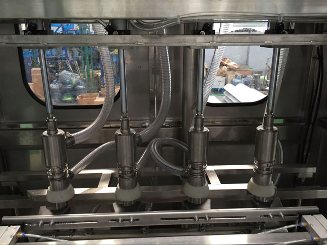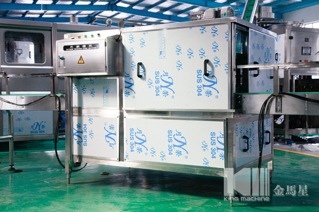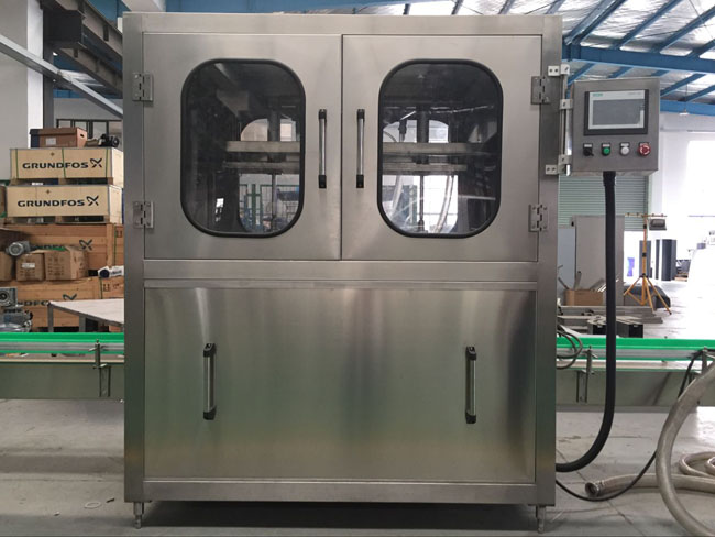 本設備集合了消毒、沖洗、灌裝和壓蓋,合四為一,能夠實現全自動桶裝水旋蓋。沖瓶機使用多種沖品液和消毒液,以保證獲得沖瓶和殺菌效果。消毒液可以循環使用,節省消耗。