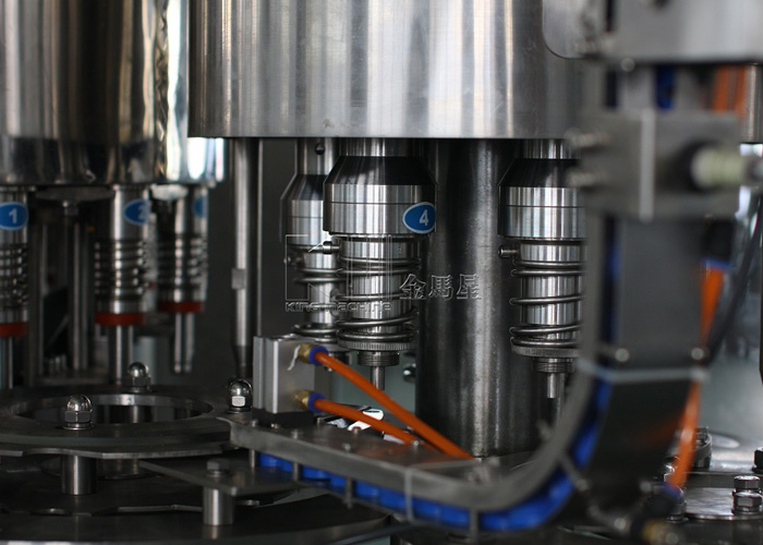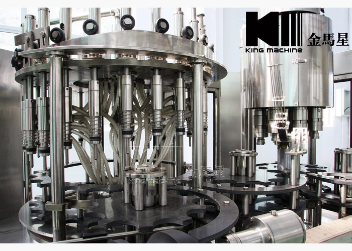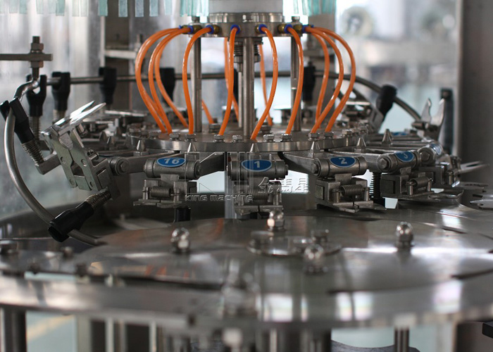 從沖瓶系統過來的瓶子經撥瓶星輪撥至灌裝系統的托瓶頸裝置上,并隨回轉底座順時針旋轉,瓶托沿凸輪導軌上升將空瓶托起,在托瓶頸裝置里的彈簧力作用下瓶口與灌裝閥閥座封嚴,然后開始灌裝。灌裝分為四個過程:開閥進氣、進液回氣、液滿關閥、放氣回位。灌裝完畢后,實瓶開始下降至起始高度,然后由灌裝封口轉瓶機構的撥瓶星輪沿弧形導瓶板送至封口機構,進行封蓋。